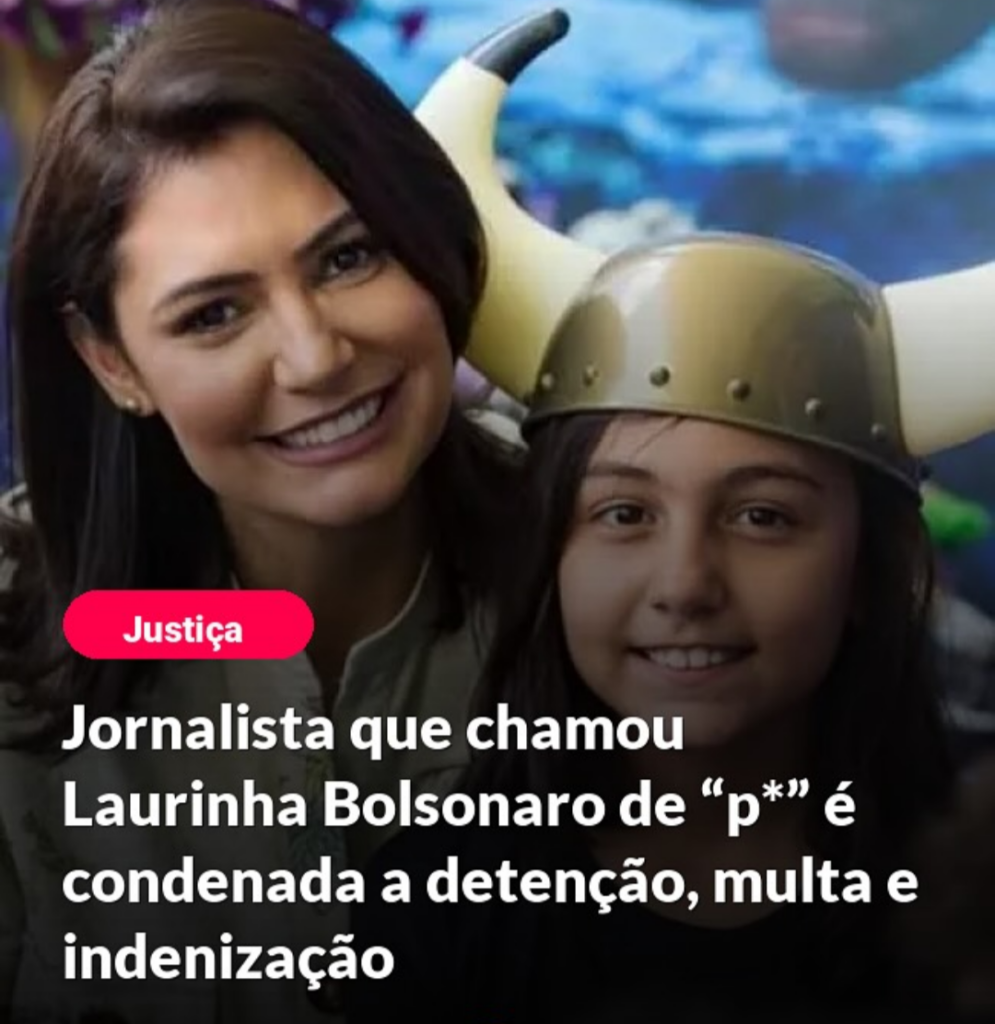 Jornalista que chamou Laurinha Bolsonaro de ‘puta’ é condenada a detenção, multa e indenização Decisão fixa 3 meses e 30 dias de detenção, multa de 10 salários mínimos e indenização de R$ 10 mil após ofensiva nas redes sociais envolvendo a filha de Michelle e do ex-presidente Jair Bolsonaro. Foto: Reprodução/X A jornalista Bárbara Gancia foi condenada a 3 meses e 30 dias de detenção pelo crime de injúria cometido contra Laurinha Bolsonaro, filha de Michelle e do presidente Bolsonaro. A sentença inclui também o pagamento de multa correspondente a 10 salários mínimos e uma indenização fixada em R$ 10 mil. A decisão decorre de publicações feitas por Gancia nas redes sociais, quando, ao criticar o presidente por um caso envolvendo adolescentes venezuelanas, ela citou Laura e a chamou de “p…”. Na ocasião, a jornalista escreveu que, “para bolsonarista imbrochável feito o nosso presidente, quando a filha do Bolsonaro se arruma, ela parece uma p…”. A primeira-dama Michelle Bolsonaro reagiu imediatamente após a publicação, afirmando: “Só lembrando a esta senhora que minha filha Laura é uma criança. Medidas serão tomadas”, em postagem realizada no Instagram. O advogado João Henrique N. de Freitas, responsável pela representação judicial, afirmou que a condenação confirma o zelo e a responsabilização por ataques contra menores. “Alertei à época, e reafirmo agora: nas agressões como aquela à filha de D. Michelle e do Pr Jair Bolsonaro não ficarão impunes. Criança é sagrada, e não instrumento político”, declarou.